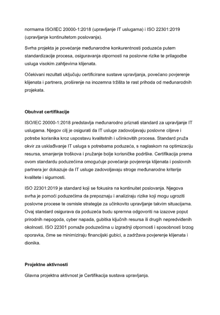The project aims to improve the quality of services and business processes of the company InterSolutio d.o.o. through implementation and certification according to the internationally recognized standards ISO/IEC 20000-1:2018 (IT service management) and ISO 22301:2019 (business continuity management). The purpose of the project is to increase the international competitiveness of the company through process standardization, ensuring resilience to business risks, and adapting services to high client requirements.
