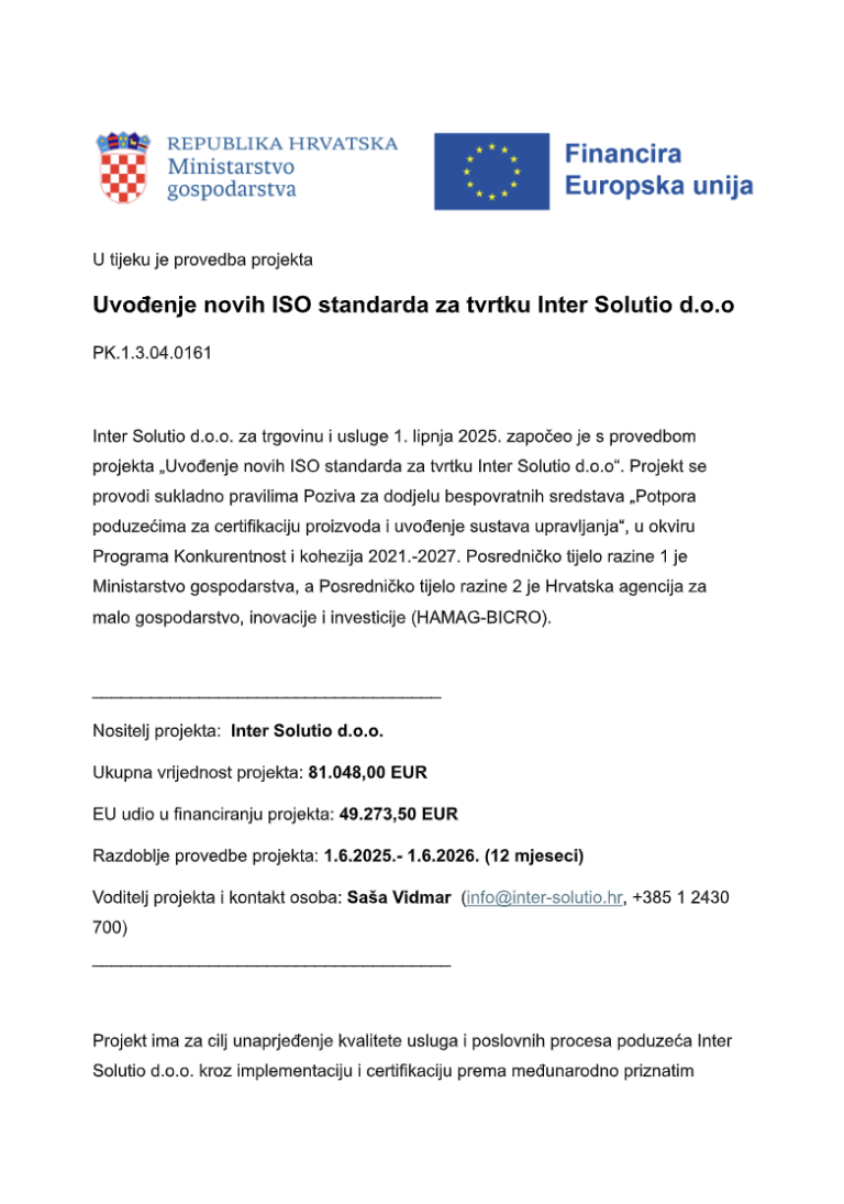 Inter Solutio d.o.o. for trade and services began implementing the project “Introduction of new ISO standards for the company Inter Solutio d.o.o” on June 1, 2025. The project is being implemented in accordance with the rules of the Call for Grants “Support to Enterprises for Product Certification and Introduction of Management Systems”, within the Competitiveness and Cohesion Programme 2021-2027. The Level 1 Intermediary Body is the Ministry of Economy, and the Level 2 Intermediary Body is the Croatian Agency for Small Businesses, Innovation and Investments (HAMAG-BICRO).